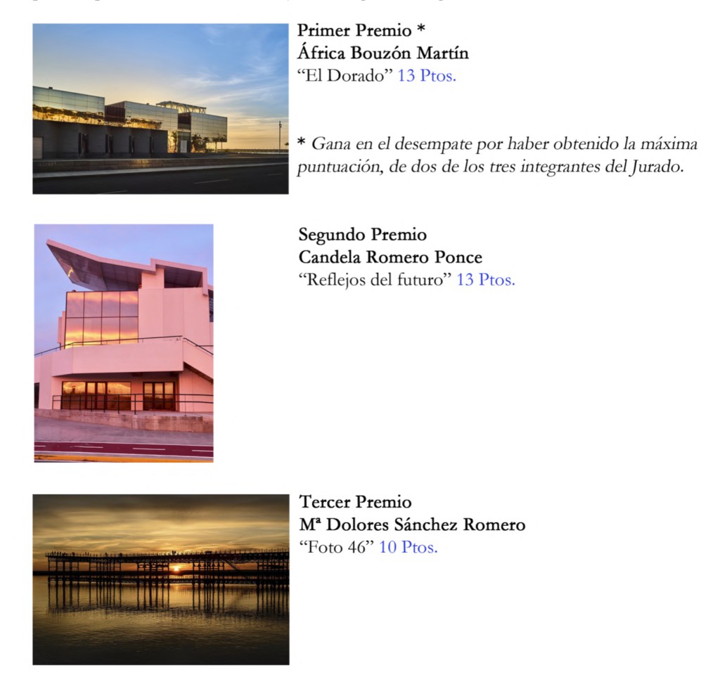 El jurado estaba formado por Fran Fernández, Alberto Domínguez y María Clauss, que tras valorar las 52 fotografías presentadas por 23 participantes, realizando un preselección de 8 fotos finalistas, de las cuales se procedió a puntuar, llegando al resultado final, siendo elegida como foto ganadora “El Dorado”, de África Bouzón Martín, quedando en segundo lugar “Reflejos del futuro”, de Candela Romero Ponce, y como tercera clasificada “Foto 46”, de Mª Dolores Sánchez Romero.